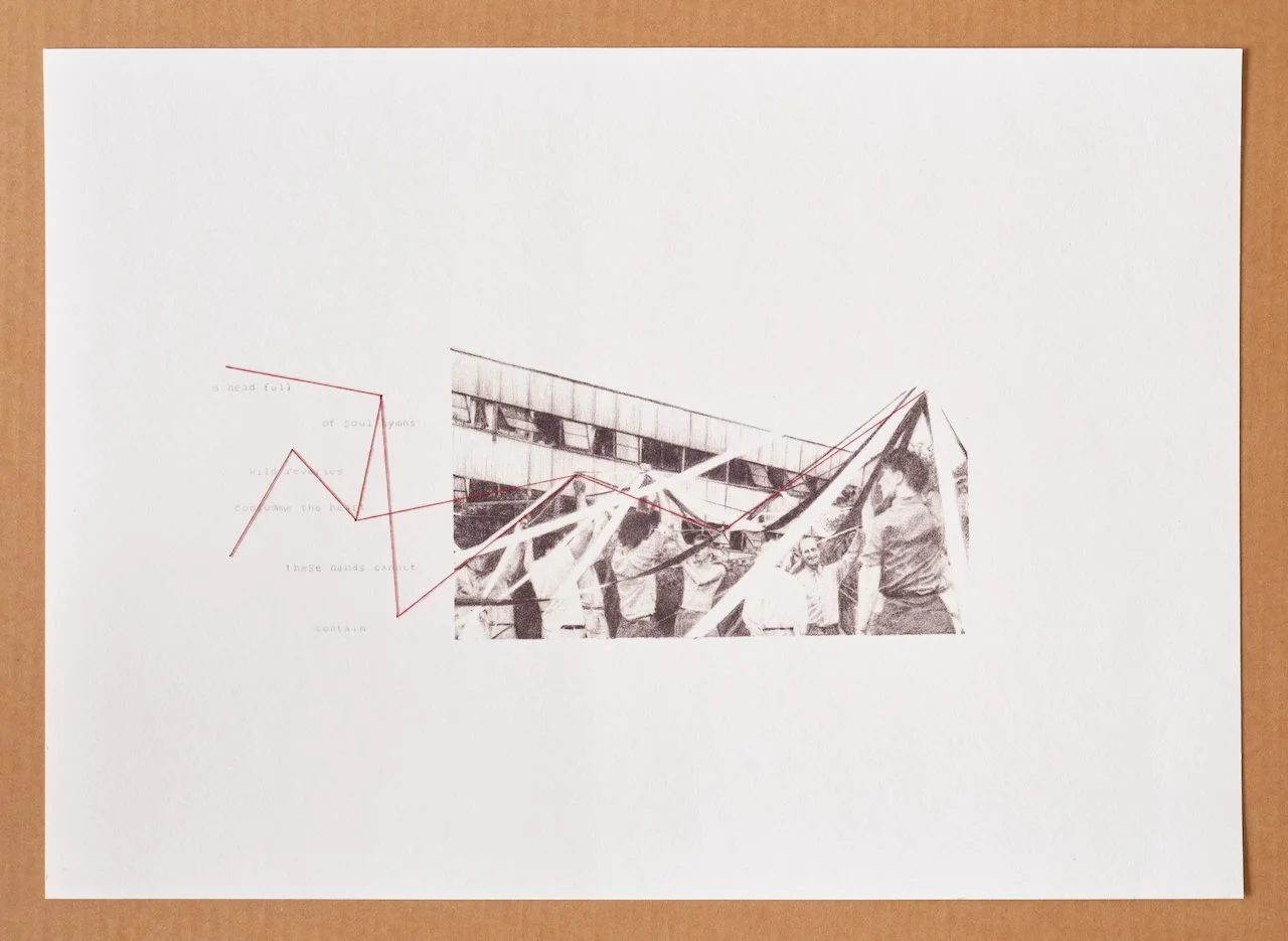 Above: Head, Heart, Hand (Black Mountain College Series), 2025, Niamh Clarke, Digital Print on Paper with Stitch and Text.